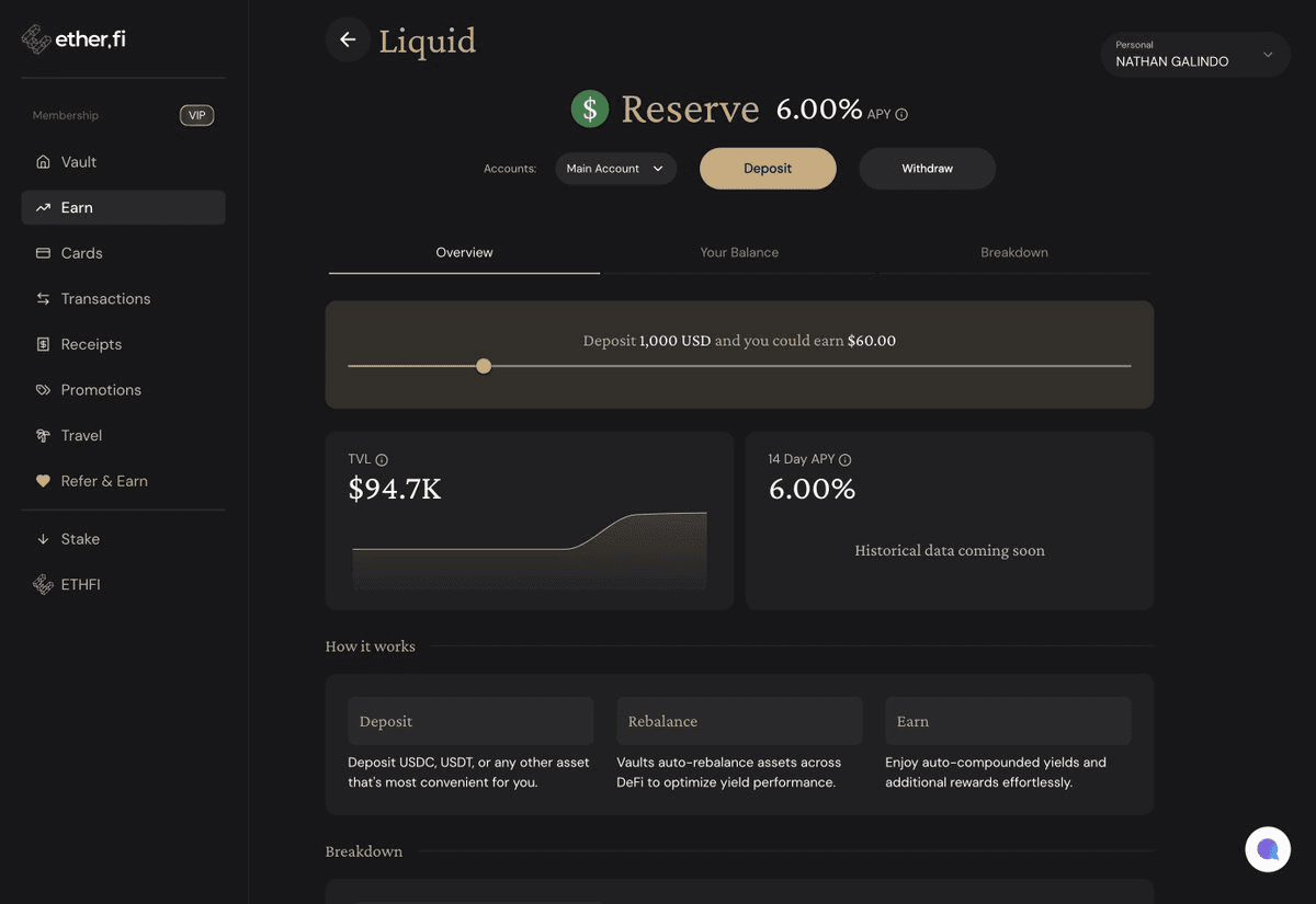 Ether.fi has made its **Liquid Reserve vault available to U.S. users**, offering a straightforward way to earn rewards on USD holdings through DeFi opportunities. **Key Features:** - Access through the Earn page on the Liquid platform - Part of ether.fi's DeFi-native vault infrastructure - Designed for simple yield generation on dollar holdings The vault represents an expansion of Liquid's offerings, bringing institutional-grade DeFi access to retail users in the United States. Users can explore the vault at [ether.fi/app/cash/earn/liquid/reserve](https://www.ether.fi/app/cash/earn/liquid/reserve)