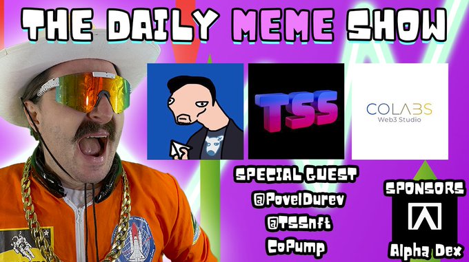 BIG UP THE DAILY MEME SHOW TODAY!! ππ TUNE IN 7PM UK/ 2PM EST / 11AM PST WITH SPECIAL GUESTS @PovelDurev @TSSnft @dm_zolot THANK TO OUR SPONSORS @alpha_dex_trade JOIN US THIS EVENING FOR ALL THE MEMECOIN FUN!! ππππ