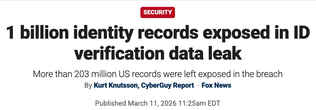 **A massive data breach has exposed 1 billion identity-verification records, with over 203 million belonging to Americans.** This incident highlights a critical flaw in centralized digital identity systems: - Mandatory digital ID and age-verification systems concentrate sensitive data in single points of failure - Unlike passwords, identity data cannot be changed once compromised - The breach follows a pattern: an Illinois government breach earlier this year exposed 700,000 health records **The core issue**: Centralizing identity data doesn't reduce risk鈥攊t amplifies it by creating attractive targets for attackers. As governments push for age verification laws requiring websites to collect and store ID information, this breach serves as a stark reminder that even well-resourced agencies struggle to protect sensitive data. The question remains: if government systems with compliance teams fail, why would commercial platforms fare better?