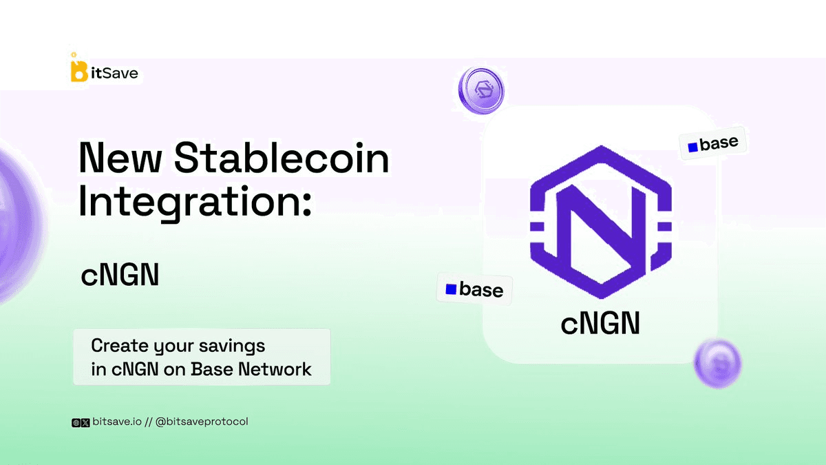 Bitsave Protocol has integrated CNGN, a Naira-pegged stablecoin, expanding savings options beyond USDC and USDT. **Key Features:** - Users can now create savings plans in CNGN alongside existing stablecoin options - The integration aims to serve onchain earners with currency options that match their needs - Platform operates on Base and Celo networks **Background:** Bitsave was recognized by Web3Nigeria as one of five emerging projects to watch in 2025. The protocol supports multiple stablecoins including USDC, cUSD, Glo Dollar, and GoodDollar. The addition of a Naira-pegged option provides African users with a familiar currency denomination for building savings habits onchain. [Learn more about Bitsave Protocol](http://Bitsave.io)
