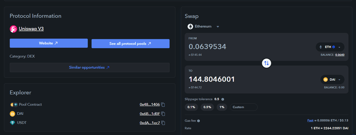 A DeFi platform has launched an integrated interface that consolidates multiple functions on pool pages: **Key Features:** - Built-in token swaps directly on pool pages (e.g., ETH to DAI on Uniswap V3) - Instant access to contract addresses for verification - One-click navigation to similar opportunities and protocol resources **Benefits:** - Eliminates tab switching during trading workflows - Combines research, validation, and execution in a single interface - Streamlines the user experience for DeFi operations The update builds on previous embedded onchain actions that allowed users to swap, buy, send, place limit orders, and provide liquidity without leaving token and pool detail pages.