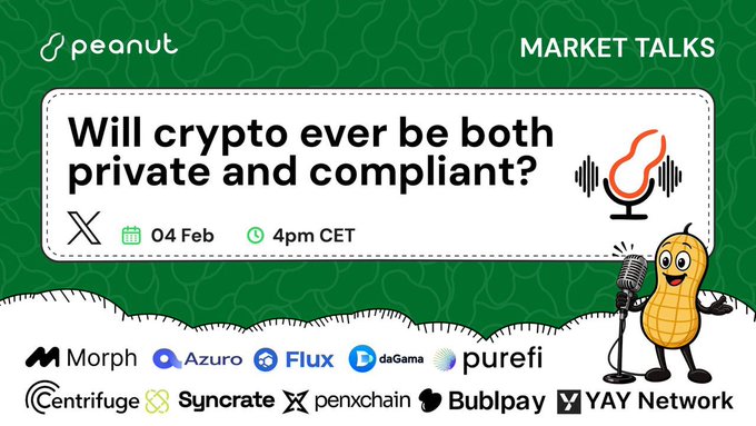 馃帣锔廝eanut market talks: will crypto ever be both private and compliant? Space: Feb 04 / 4pm CET Speakers: @MorphNetwork @azuroprotocol @RunOnFlux @dagama_world @centrifuge @PureFi_Protocol @syncratelabs @PENXCHAIN_ @BublPay @yaynetwork Notifs on 馃敂