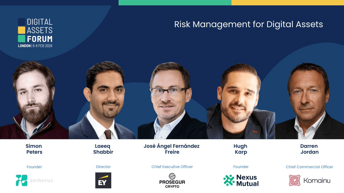 A panel discussion on risk management for digital assets is taking place at DAF Global. **Featured Speakers:** - Hugh Karp (Nexus Mutual) - Simon Peters (Xerberus) - Laeeq Shabbir (EY) - Darren Jordan (Komainu Custody) - José Ángel Fernández Freire (Prosegur Global) The panel focuses on strategies and practices needed for long-term survival in the digital asset space, covering institutional-grade risk management approaches.