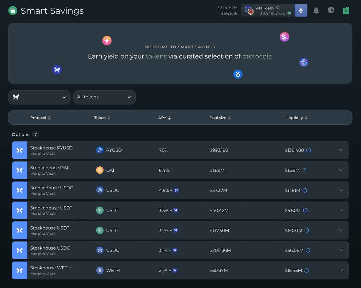 **Yearn V3 launches** with automated yield strategies that rotate between protocols to find optimal risk-adjusted returns. **New yield options now available:** - **Steakhouse Morpho vaults** - institutional-grade risk management from Morpho's largest stablecoin curator - **Spark Savings** - powered by Sky's Liquidity Layer, anchored to Sky Savings Rate with RWA backing - **Sky Ecosystem Savings Rate** - earn yield on USDS with instant redemptions The platform automatically allocates between different strategies including SKY, SPK, Aave, and Compound to maximize returns without user intervention. **Enhanced USDS options** include a Liquid Locker Compounder Vault that stakes in the USDS-1 vault while earning additional YFI rewards. Users don't need to take any action - the vaults handle strategy optimization automatically in the background.