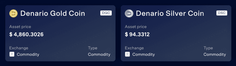 **Denario Swiss has launched $DSC and $DGC**, tokenized precious metals representing one ounce each of 999.9-purity silver and gold. **Key features:** - Physical assets stored in insured Swiss duty-free warehouses - Full commodity backing with no coverage limits (unlike CHF 100,000-capped bank deposits) - Physical redemption rights available to holders at any time - Digital co-ownership model for precious metal investments **DIA partnership:** DIA provides high-fidelity price feeds for $DSC on Polygon, reporting real-time silver market values across EUR, USD, and CHF. This enables secure transactions and DeFi integrations. The collaboration bridges traditional commodities with decentralized finance, allowing users to access precious metals through decentralized applications. [View price feeds](https://www.diadata.org/app/rwa/)
