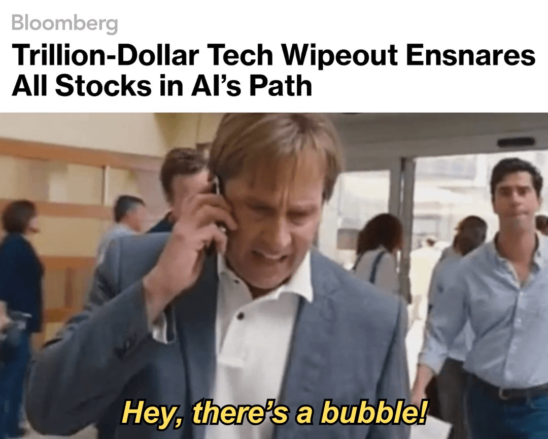 **Major tech stocks experienced a massive $1 trillion slide**, raising questions about the sustainability of AI-driven market valuations. **Key concerns:** - Market observers comparing current conditions to historical bubbles - Previous analysis warned of potential 30-50% equity plunge if AI bubble pops - Risks include GDP contraction, unemployment spike to 10-15%, and financial strain **Potential impacts:** - Stranded assets in data centers and energy infrastructure - Supply chain disruptions in chips and power sectors - Bank insolvencies from $3-5T write-downs The trillion-dollar drop has intensified debate about whether artificial intelligence investments have been overvalued and what a correction could mean for broader markets. [Read full analysis](https://wallstmemes.com/news/tech/tech-stocks-just-had-a-trillion-dollar-slide-is-the-ai-bubble-bursting/?utm_source=Twitter&utm_medium=Wallstmemes+-+Twitter&utm_campaign=Articles)