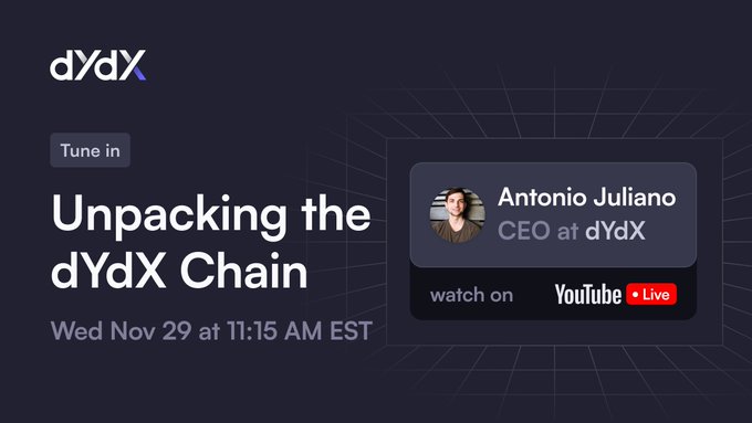 dYdX Chain trading is live and so are trading rewards 🤑 💸 Learn more about dYdX, the Chain, and the new rewards with our CEO and Founder @antonioMjuliano! ⏰ Nov 29 11:15 AM EST: youtube.com/watch?v=ZxTMNK…