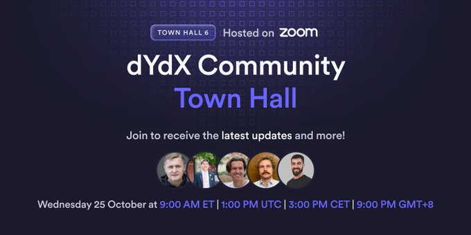 Don’t miss the 6th dYdX Community Town Hall tomorrow, featuring @dYdX, the @dydx_ops_subdao, and more. In the Town Hall; 👐 Open Sourcing & Public Benefit Corporation ⛓️ dYdX Chain Genesis 📊 Alpha & Beta Periods 🚨 Important timelines to pay attention to 📅 Wednesday, 25th