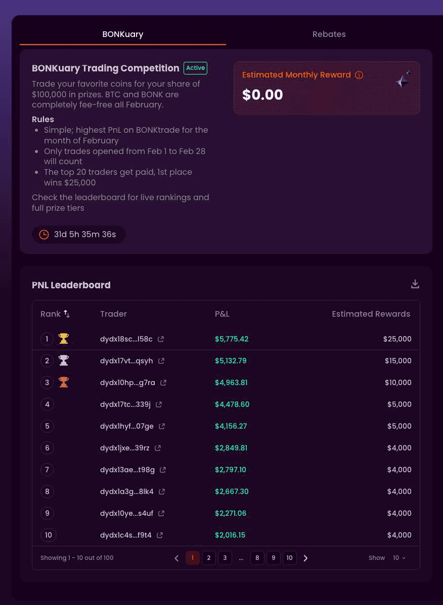 dYdX's **$100K trading competition** on bonk.trade is now live as part of Surge Season 11. **Key Details:** - Trade any market and compete based on PnL performance - Leaderboard rankings determine prize distribution - Zero-fee trading on BTC & BONK perpetuals - Additional perks include liquidation rebates up to $1M - $200K Affiliate Booster Program running concurrently The competition is part of dYdX's February initiatives to drive trading activity on their decentralized exchange platform. [Learn more](http://www.dydx.xyz/blog/february-kickoff-surge-season-11-and-200k-affiliate-booster-program) | [Check leaderboard](http://bonk.trade)