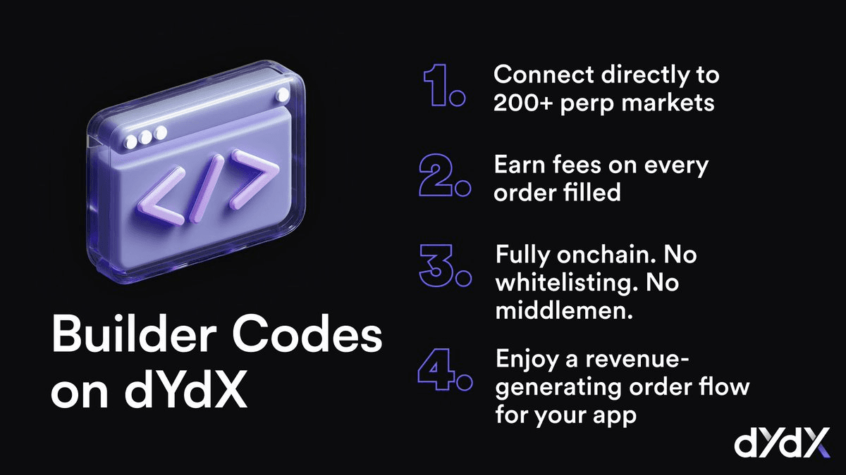 dYdX has introduced **Builder Codes**, a new system that allows developers to integrate with the platform and track their impact transparently. **Key features:** - Projects can plug into dYdX perpetuals and route orders onchain - Builders earn rewards on every fill through their integration - No whitelists required - fully open and transparent system - dYdX will spotlight successful projects built using the system The initiative removes guesswork for developers building on the decentralized exchange, providing clear metrics and direct compensation for their contributions. Learn more about Builder Codes: [dYdX Blog](https://www.dydx.xyz/blog/builder-codes)