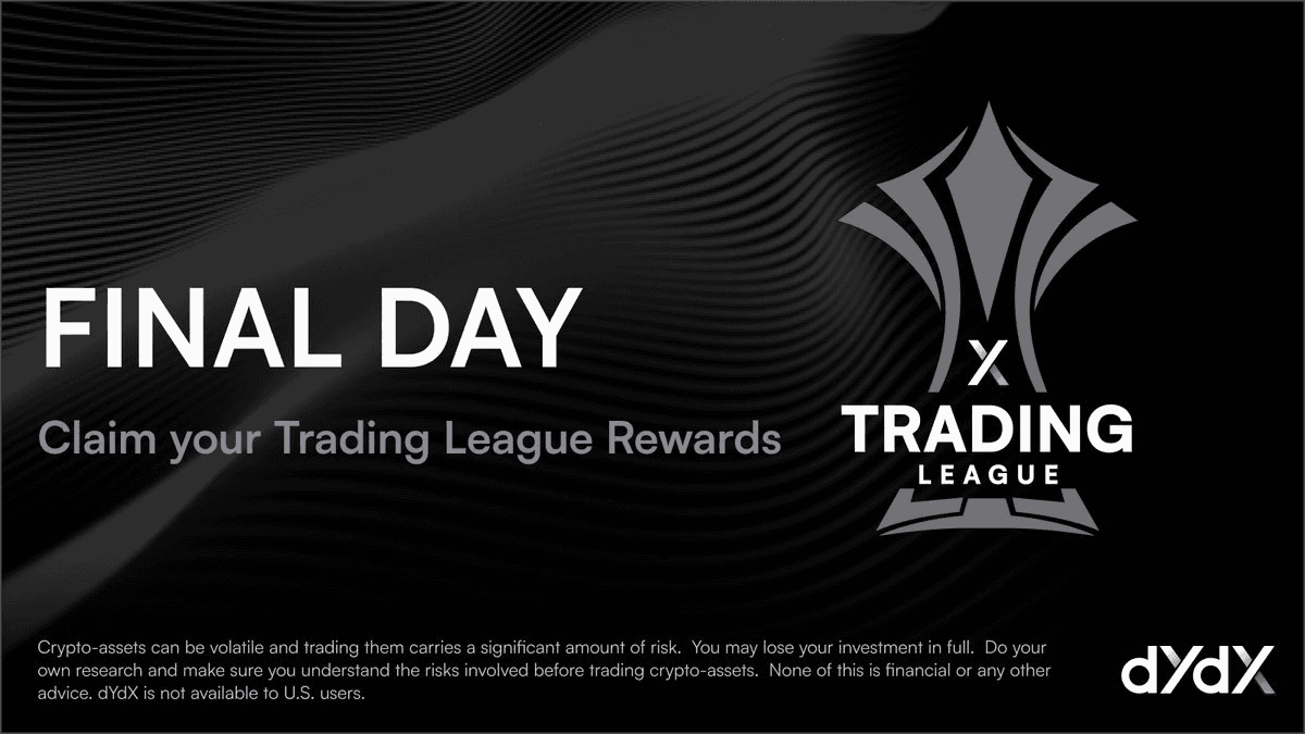 **Final hours to claim dYdX Trading League rewards** Traders who participated in dYdX Trading Leagues have until **January 31** to claim their rewards. This is the last opportunity to collect any earned incentives from the competition. **Key details:** - Claims close today, January 31 - Participants should check eligibility status - Unclaimed rewards will be forfeited after the deadline Traders can verify their eligibility and claim rewards at [dydx.xyz/trading-league-rewards](https://dydx.xyz/trading-league-rewards?utm_source=dYdXTwitter&utm_medium=GlobalSocial&utm_campaign=GlobalSocial) **Action required:** Check your account and claim any pending rewards before the deadline passes.