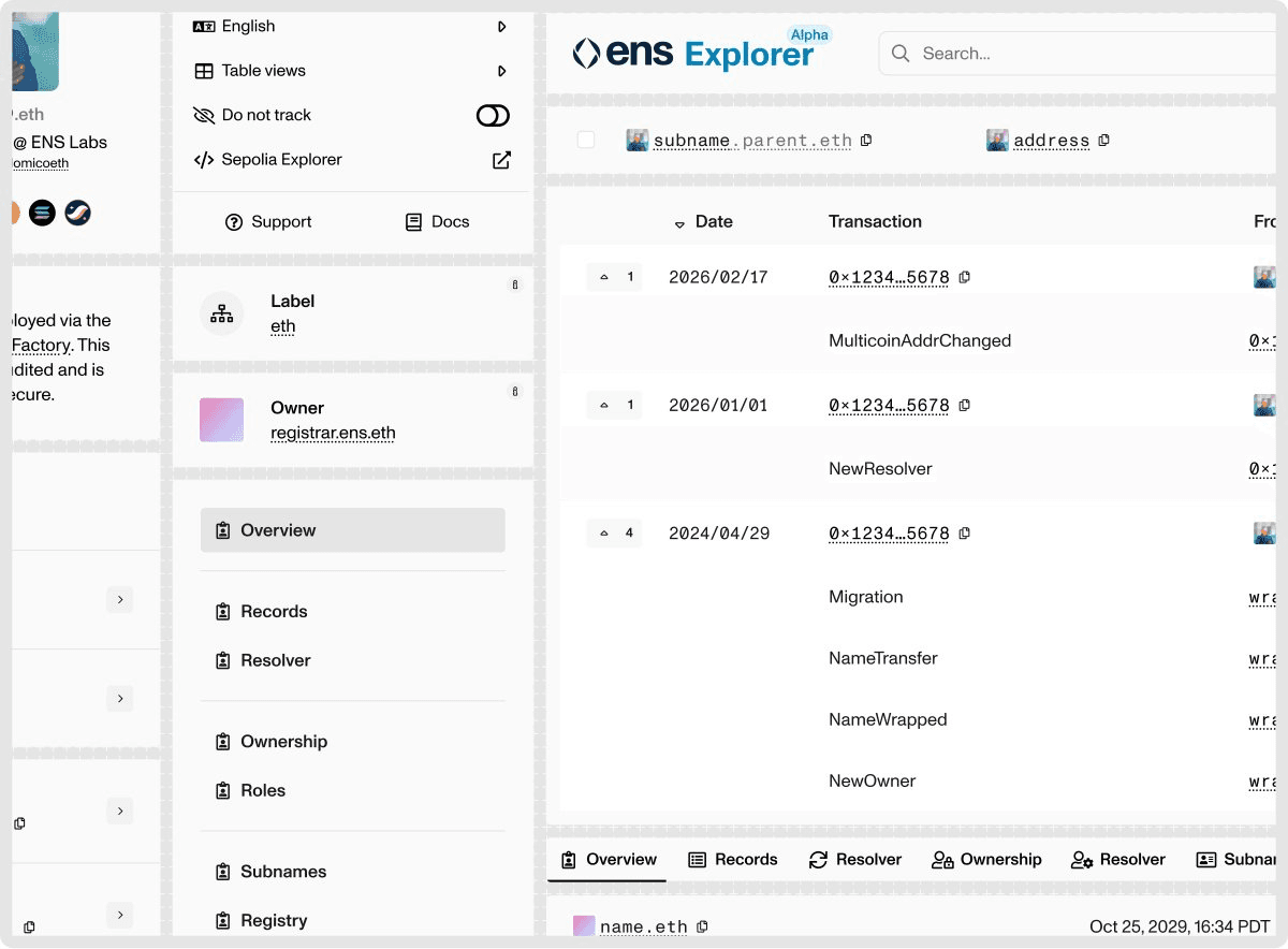 ENS has released the **ENS Explorer**, a dedicated tool designed to provide visibility into the protocol's growing complexity. As ENS names have evolved beyond simple labels, they now involve multiple components: - Different contracts and resolvers - Permission structures - Subname configurations - Cross-application behaviors The Explorer surfaces key information including control settings, resolution paths, historical changes, and protocol context. This allows users and developers to understand how names are configured and how they reached their current state. Key features include: - Dedicated resolver pages for inspecting how ENS data is served - Support for flexible setups where multiple names share records through a single resolver - Automatic wallet balance refreshes when switching views - Enhanced social sharing with richer preview cards The tool aims to serve as a source of truth for ENS, using accurate protocol terminology and surfacing technical details that management interfaces alone cannot provide. [Read the full deep dive](https://ens.domains/blog/post/ens-explorer-deep-dive)