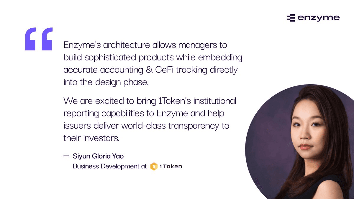 Asset managers running strategies across centralized exchanges, DeFi protocols, and multiple wallets face a critical challenge: accurate reporting. Inconsistent data sources make it difficult to provide reliable valuations to investors. **The Solution** Enzyme has partnered with [1Token](https://enzyme.finance/blog-posts/enzyme-and-1token-partnership?utm_source=x&utm_medium=organic&utm_content=post) to address this problem: - Reconciles data from both CeFi and DeFi sources - Provides unified valuation across multiple venues - Helps managers maintain investor confidence through transparent reporting This follows Enzyme's recent integration with Octav, showing a pattern of building infrastructure for cross-chain and multi-venue asset management. **Why It Matters** As crypto strategies become more complex, spanning different chains and platforms, accurate position tracking becomes essential for institutional adoption and investor trust.