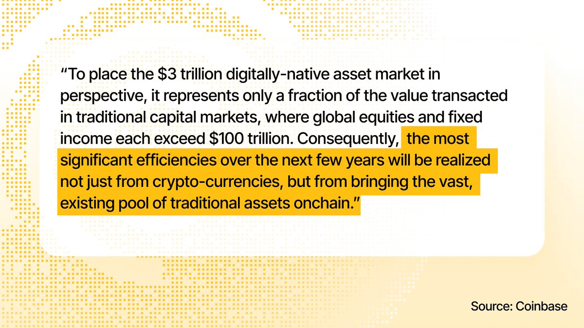 The biggest opportunity in finance isn't creating new crypto assets - it's moving existing traditional markets onto blockchain infrastructure. **The Scale** - Over $100 trillion in existing financial markets - Legacy systems currently handle settlement - Blockchain offers efficiency improvements **What's Changing** Traditional financial instruments and markets are beginning to settle transactions onchain rather than through conventional systems. This represents a fundamental shift in how established markets operate. **Why It Matters** Tokenization enables legacy market value to leverage blockchain's settlement advantages - faster processing, reduced intermediaries, and improved transparency. The focus is on infrastructure efficiency rather than asset creation.