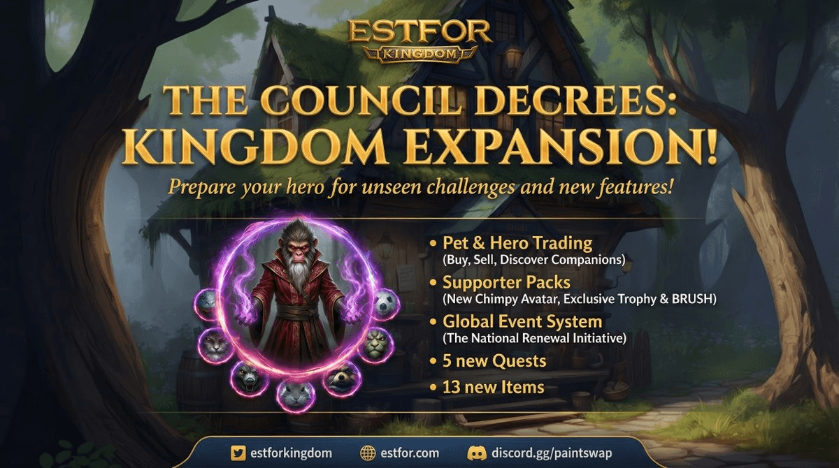 Estfor Kingdom has introduced several new features to its medieval fantasy idle game: - **Pet & Hero Marketplace**: Players can now trade pets and heroes directly - **New Supporter Packs**: Additional support options available for the community - **Kingdom-wide Global Event**: A collaborative event spanning the entire game world The updates expand the game's existing NFT ecosystem, which includes over 350 unique items across three collections (players, items, and pets). All assets remain fully transferable on secondary marketplaces. Estfor Kingdom operates as a browser-based blockchain game on the Fantom Opera network, featuring 16+ skills, idle progression mechanics, and competitive leaderboards. Players can queue up to three actions spanning 24 hours, allowing characters to progress while offline.