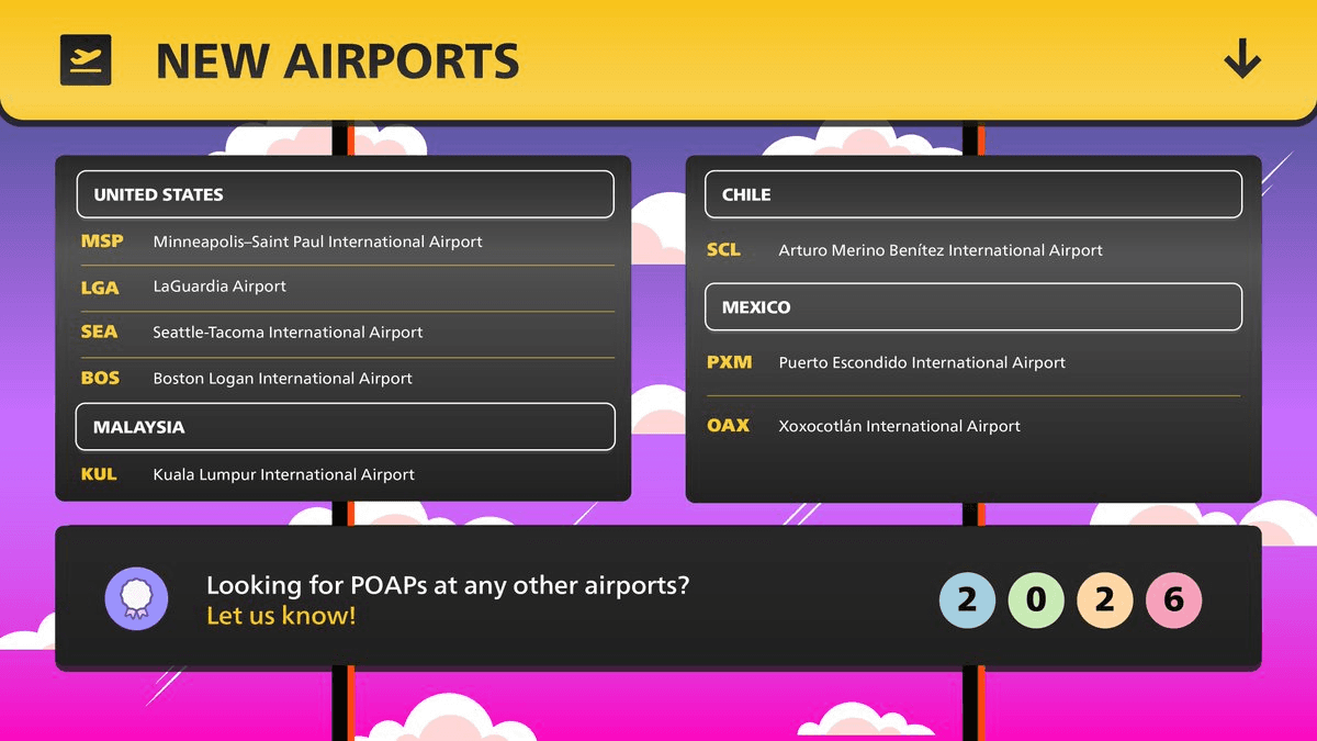 The POAP Airport Rally has launched at **8 new airports** across the globe, allowing travelers to collect digital mementos of their journeys. **Now live at:** - MSP (Minneapolis) - LGA (New York) - SEA (Seattle) - BOS (Boston) - KUL (Kuala Lumpur) - PXM (Puerto Escondido) - OAX (Oaxaca) - SCL (Santiago) Travelers can **check in and collect POAPs** using the POAP Home app's location scanning feature. Additional airports will be added throughout 2026, expanding the rally's global reach.