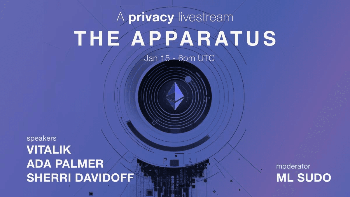 A livestream discussion titled "The Apparatus" brings together Vitalik Buterin, SciFi author and historian Ada Palmer, and professional hacker Sherri Davidoff on January 15 at 6pm UTC. The panel, moderated by ml_sudo, will explore three theories on why privacy continues to face challenges and discuss potential strategies to reverse this trend. [Watch the livestream](https://x.com/i/broadcasts/1yNGabWMMXQJj)