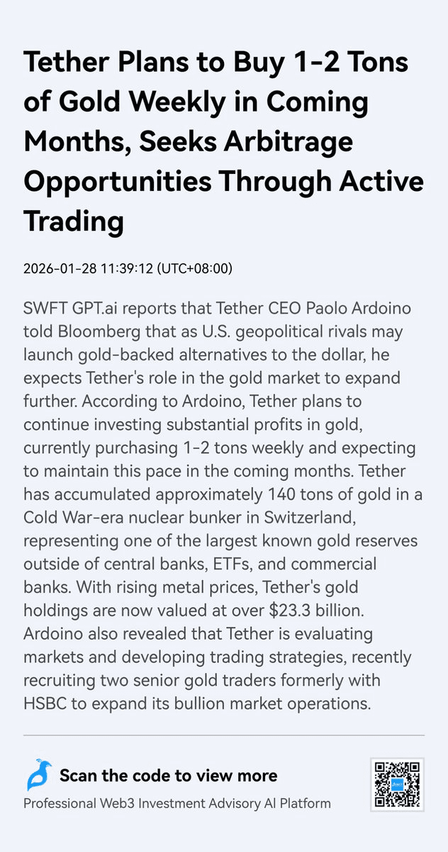 Tether is significantly expanding its gold holdings, purchasing 12 tons weekly according to CEO Paolo Ardoino. The company now stores approximately 140 tons of physical gold in a Swiss bunker, valued at $23.3 billion. **Key developments:** - Weekly purchases of 12 tons of gold - Total holdings of ~140 tons stored in Switzerland - Current valuation: $23.3B - Hired former HSBC gold traders - Represents one of the largest non-government gold reserves globally The stablecoin issuer is quietly building substantial precious metal reserves while bringing in experienced traders from traditional finance. This strategic pivot into physical gold marks a notable diversification from Tether's core digital asset business.