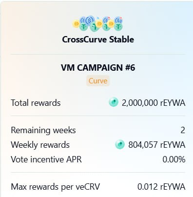 π EYWA offering the biggest bribes for CrossCurve pools! π° Sending over $0,5M (4M rEYWA) to buy votes from $vlCVX and $veCRV voters. βοΈ Highest deposit to Votemarket among all the $veCRV markets this round! CrossCurve strives to establish its key role in the @CurveFinance