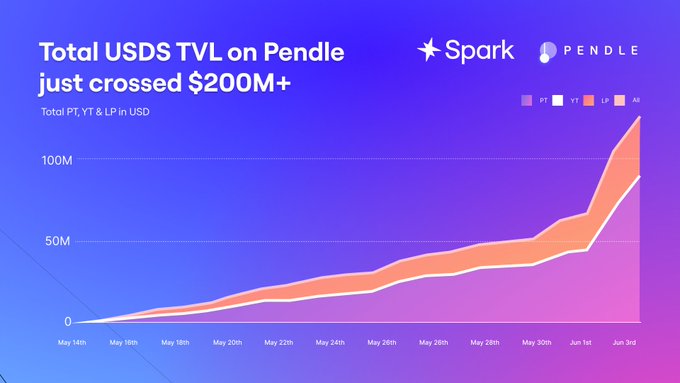 $100M+ USDS flowed into @pendle_fi in just the last 24hrs. Pushing the total TVL to $200M+ and marking another ATH. USDS was introduced as part of Pendle's RWA lineup to drive adoption, with a 25x Spark Points boost for supporting USDS liquidity. Here's all about it 👇