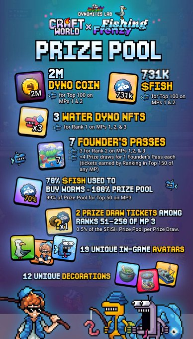 **Fishing Frenzy x Craft World** collaboration event launches **Wednesday, December 3rd at 2pm UTC**. **Massive Prize Pool includes:** - 7 Founders Pass NFTs - 3 Water Dyno NFTs - 731k $FISH tokens - 2M Dyno Coin - 19 exclusive avatars - 12 building decorations **How to participate:** - Download Craft World or play browser version - Reach level 10 to unlock the event - Collect special resources and contribute to community Masterpieces - Trade resources with other players (unlocks at level 12) **$FISH mechanics:** - Convert $FISH to in-game WORMS to fuel your DYNO FISH Mine - 70% of $FISH used for WORMS distributed as rewards to top winners - One-way process - tokens cannot be withdrawn once converted **Bonus features:** - Fishing Frenzy Karma Points unlock extra workers - Prize draws for ranks 51-250 and bonus Founders Pass draws - No NFTs required to play Event runs for limited time with exclusive rewards only available during the collaboration period.
