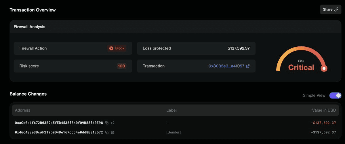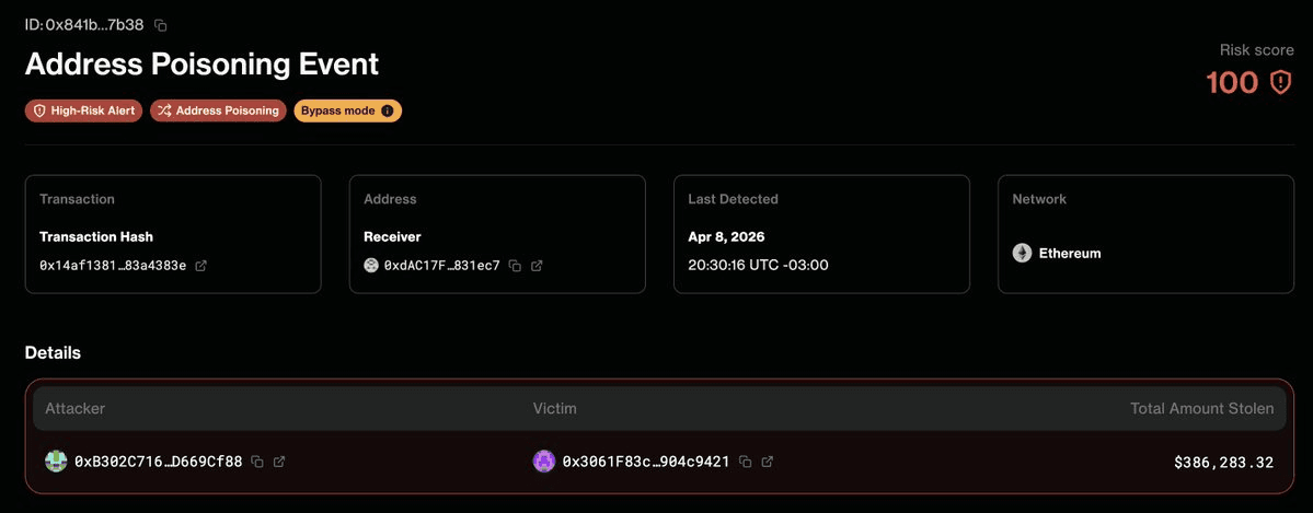 A user lost **$386,000** by sending funds to a fraudulent address that closely resembled a legitimate one in their transaction history. **How the attack works:** - Scammers plant near-identical addresses in a victim's transaction history - Users copying addresses from their history accidentally select the fake one - The attack exploits common habits rather than technical vulnerabilities This follows a similar **$600K USDT** address poisoning attack in February, where a look-alike address was planted 32 minutes before the victim's transaction. [Forta Firewall](https://forta.org/firewall?utm_source=twitter&utm_medium=social&utm_campaign=firewall-update&utm_content=ink-case-study) detected both incidents in real-time and can block such attacks on protected chains. **Protect yourself:** Always verify the complete address before sending transactions, not just the first and last few characters.