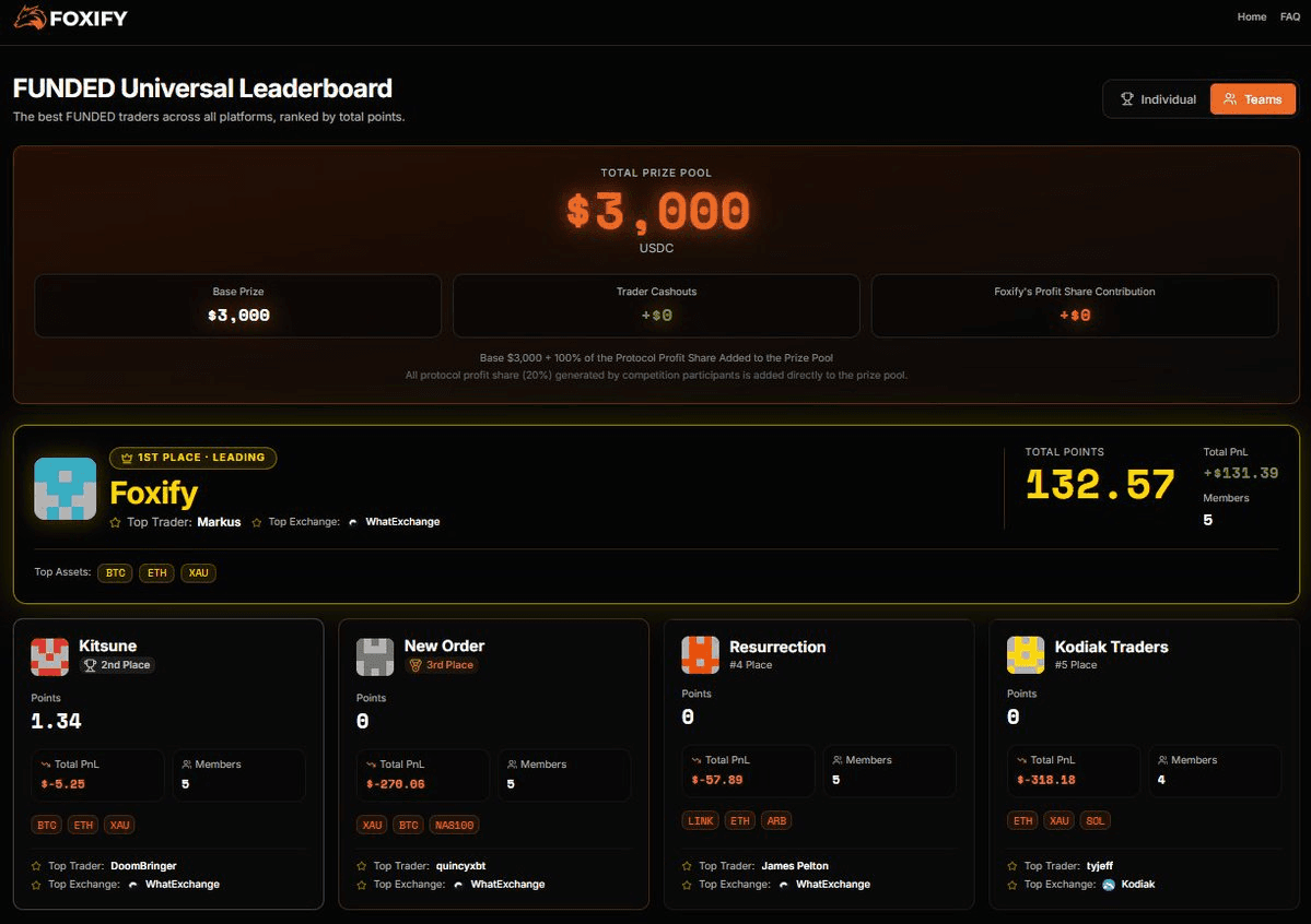 Foxify has launched a real-time leaderboard allowing users to track funded traders and their challenge performance across multiple decentralized exchanges. **Current Top 10 Distribution:** - 4 traders on Whatexchange - 3 traders on KodiakFi - 2 traders on Foxify - 1 trader on dYdX The platform provides instant funded accounts for traders, integrating directly with their preferred DEX venues. Foxify is currently live on dYdX, KodiakFi, and Whatexchange, with upcoming launches planned for Hyperliquid and additional platforms. [View the leaderboard](https://app.foxify.trade/en/leaderboard/funded-challenge)
