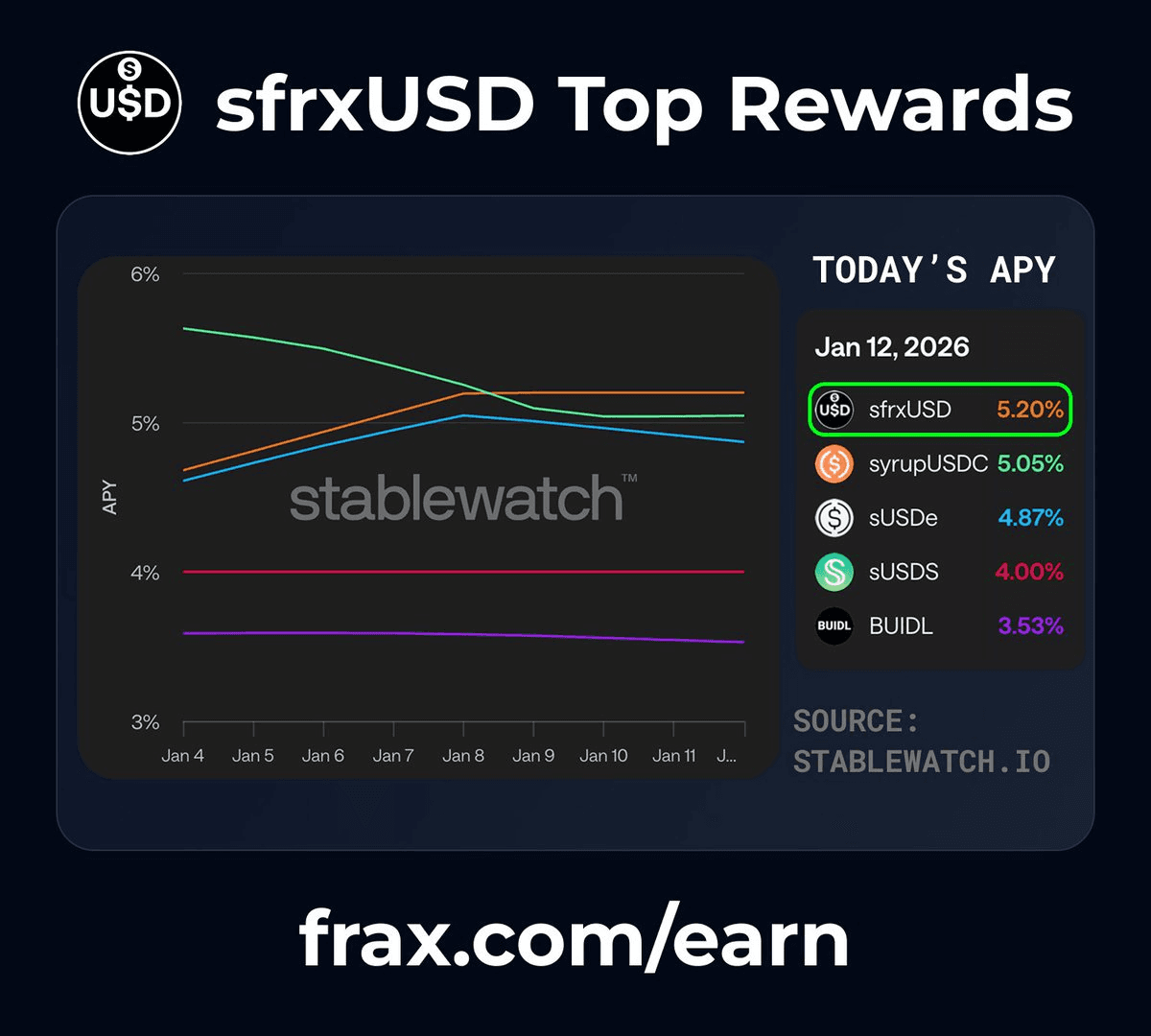 Frax Finance has positioned its sfrxUSD as a leading yield-generating stablecoin option in the market. **Key Features:** - Currently offers the highest APY among major yield stablecoin options - Built by a team with 5 years of security track record - Designed as a "set-it-and-forget-it" savings solution - Available across 20+ blockchain networks The product aims to provide what Frax calls the "best risk-adjusted stable yield on-chain," targeting users seeking passive returns on their stablecoin holdings without active management.