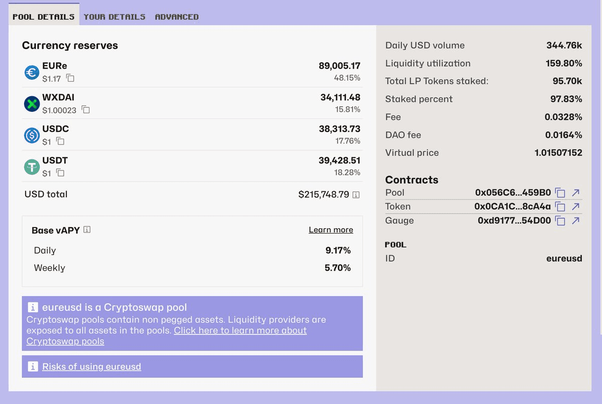 A Curve Finance EURe pool on Gnosis Chain is experiencing sustained high utilization at 150%, signaling growing demand for foreign exchange trading in DeFi. **Key Points:** - The pool runs on 2021-era code but continues to function effectively - Developers hint at improved infrastructure coming for EURe - High utilization suggests increasing appetite for stablecoin FX pairs The sustained demand indicates that decentralized foreign exchange markets may be reaching a maturation point, with traders actively seeking euro-denominated stablecoin liquidity. [View Pool](https://www.curve.finance/dex/xdai/pools/0x056c6c5e684cec248635ed86033378cc444459b0/deposit)