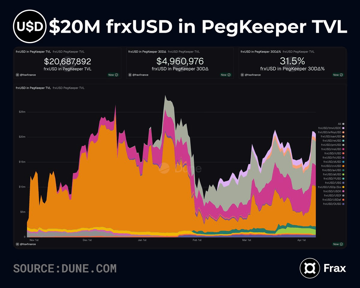 **frxUSD reaches new milestone in PegKeeper pools** - frxUSD in PegKeeper pools surpassed $20M - Total PegKeeper TVL now exceeds $50M - Over 20 protocols now pair with frxUSD, up from crvUSD dominance The PegKeeper strategies are experiencing renewed growth and diversification across the DeFi ecosystem. The expansion signals increasing protocol adoption of frxUSD as a preferred stablecoin pairing option.