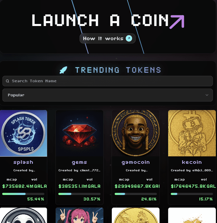 GalaPump has seen several tokens successfully graduate from its platform, demonstrating activity within the Gala ecosystem. **Graduated Tokens Include:** - Smoovcoin - TownStarPlaybook - StuMoney - FIMcoin - GalaDog - Bene - Malcoin - Moonlauncher The platform continues to host active token launches. Users can explore current offerings at [pump.gala.com](https://pump.gala.com). GalaPump operates as part of the broader GalaChain infrastructure, providing a launchpad for community-created tokens within the Gala ecosystem.
