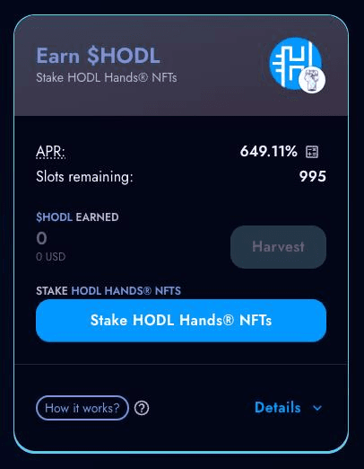 A new NFT staking opportunity launches April 1st at 12:00 UTC for HODL Hands holders. **Pool Details:** - 5,000,000 $HODL token rewards available - 45-day staking period - Limited to 1,000 NFT spots total - Maximum 20 NFTs per wallet **How to Participate:** Existing holders can stake at [hodlx.exchange/nft-pools](http://hodlx.exchange/nft-pools) New participants can acquire NFTs at [hodltoken.net/hodl-hands-nfts](http://hodltoken.net/hodl-hands-nfts) This follows HODL's ongoing development efforts, including app relaunch testing and NFT system upgrades. The project operates on BNB Chain with a current market cap around $1M.