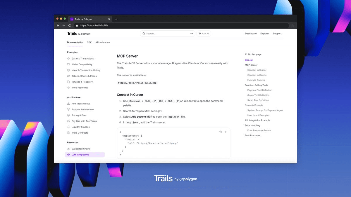 Polygon has released **Trails MCP Server**, a tool that enables AI agents to execute transactions across 50+ blockchains through a single endpoint. **Key features:** - One-click payments, swaps, and bridges - Automatic cross-chain orchestration - Integration with Claude and Cursor - Secure, unified access point for LLMs The server simplifies multi-chain operations by providing AI models with a standardized interface for blockchain interactions. Developers can add the functionality directly to their AI tools without managing multiple chain connections. This builds on Polygon's earlier agentic payment infrastructure, which included OpenClaw deployment and x402-powered payment gating. [Learn more about Trails MCP Server](https://polygon.technology)