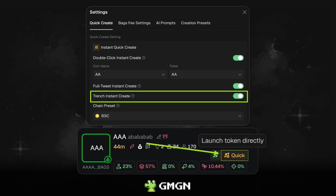 ⚡️ GMGN Update - Cooking Fourmeme Upgrade @Four_FORM_ · New support for cooking Fourmeme tokens with Tax Settings · Quickly configure Fee Earner, Burn, Dividend, Add to LP Allocation Rules - enjoy the fastest, smoothest token cooking experience! 🧑🍳 Try cooking now: