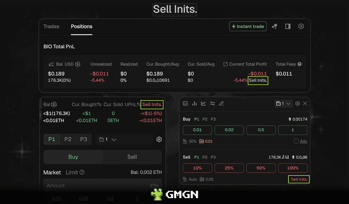 GMGN.Ai has launched **Sell Inits** functionality across Base, ETH, and Monad networks. The feature is now available in three key areas: - Classic trading module - Instant Trade - Positions All modules now support **one-click selling**, streamlining the exit process for traders across multiple chains. This update builds on recent improvements to trading infrastructure, including enhanced liquidation protection and reduced fees on Base, Arbitrum, and Ethereum networks. The rollout aims to simplify trading operations for users managing positions across different blockchain networks.