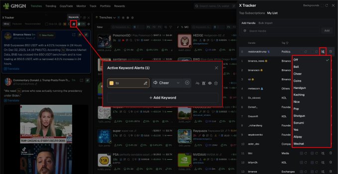 ⚡️ GMGN Update 1. X Tracker Upgrade - Added keyword settings with customizable colors and dedicated alert sounds for matching tweets - Customize alert sounds for specific Twitter accounts 🔗 Try it: gmgn.ai/follow