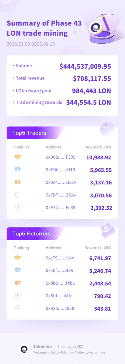 Tokenlon has concluded phase 43 of its LON trade mining program, which ended on January 19, 2026. **Key Metrics:** - Total trading volume: $444,537,009.95 - Platform revenue: $708,117.55 - LON rewards distributed: 984,443 LON Users can now claim their rewards through the Trade Mining page on the LON DApp. The buyback and distribution process for this phase is complete and ready for collection. Compared to phase 39 (completed August 2025), this phase saw lower trading volume ($444M vs $1.03B) and fewer rewards distributed (984K vs 1.39M LON). [Claim your rewards here](https://support.tokenlon.im/hc/en-us/articles/45662857037460)