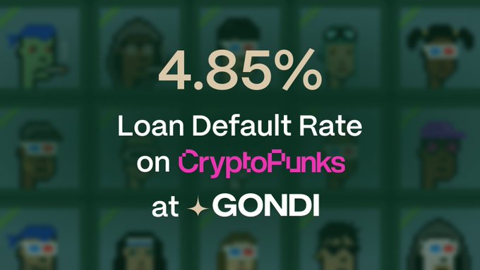 The total default rate for CryptoPunks loans on #GONDI to date is 4.85%, 43 out of 886 Punk loans. CryptoPunk USDC Loans Default Rate is 2.73% (10 out of 366 have defaulted). CryptoPunk ETH Loans Default Rate is 6.34% (33 out of 520 have defaulted).