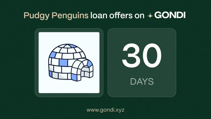 30-day loan offers are live for @PudgyPenguins on #GONDI! 🐧💸 💰 12.6 ETH | 30 days | 18.69% APR | 0.25 ETH origination fee 💵 Recent USDC loans on Pudgys have been for 25K USDC | 30 days | 18% APR | 125 USDC origination fee List your Pudgy on GONDI to find unique offers.