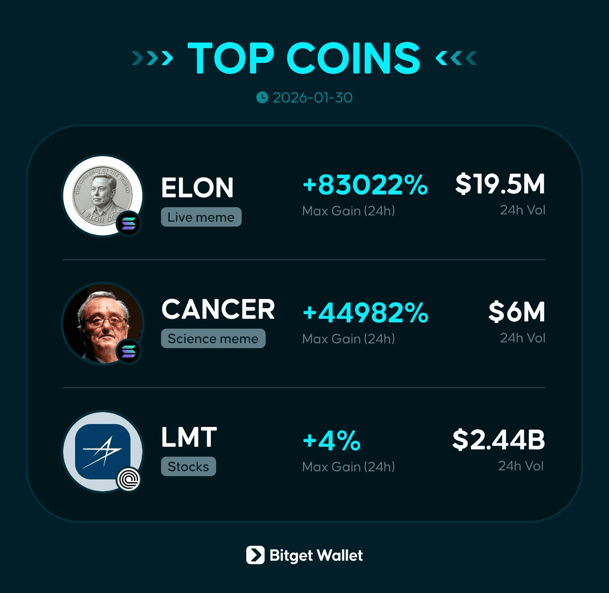 **Market Overview** Bitcoin dropped 8% with altcoins following suit in a broad market decline. Gold and silver also experienced sharp drops, marking a challenging day across multiple asset classes. **Meme Coin Activity** - **$ELON** gained attention amid rumors of Elon Musk potentially launching a meme coin - A related livestream meme coin saw explosive trading volume - **$CANCER** also featured among top picks **Traditional Markets** **$LMT** (aerospace company) stands out with a 42% surge over two months, bucking the broader market trend. The simultaneous decline in crypto and precious metals suggests broader risk-off sentiment in markets.