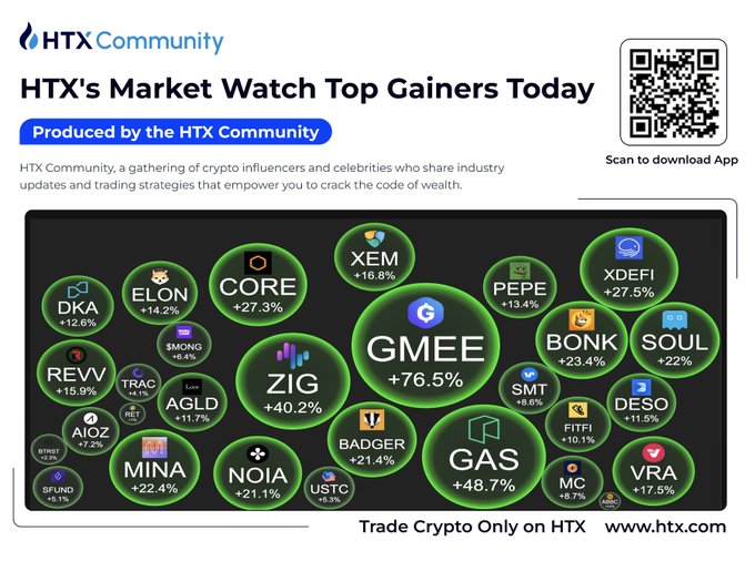 The top gainers in the #HTX market are $LIKE with 82% growth, $GMEE with 42% growth, $RNDR with 37% growth, $AVAX with 27% growth, and $AMP with 26% growth. The previous week's top gainers were $GMEE with 76.5% growth, $ZIG with 40.2% growth, $GAS with 48.7% growth, $BONK with 23.4% growth, and $BADGER with 21.4% growth.