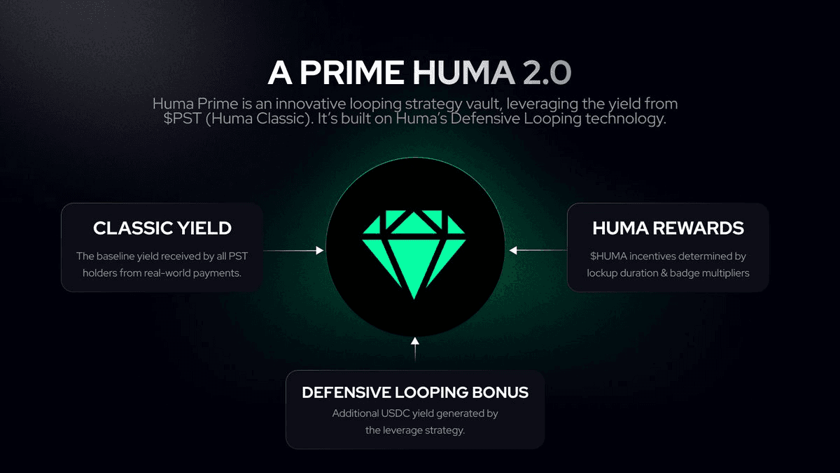 Huma Finance has revealed its updated yield breakdown for users: **Key Rates:** - Institutional-grade USDC APY: **8%** - Defensive looping APY: **5-7%** (applies to all current Prime positions, subject to periodic adjustment) - Additional Huma rewards available based on OG status, Vanguard multipliers, and staked $HUMA The defensive looping rate applies to existing Prime positions and may be adjusted periodically. Variable rewards are available for users with special badges and staked tokens. This represents a shift from the previous Classic base APY of 9% announced in October 2025, which offered up to 25.9% total APY with maximum multipliers. [View announcement](https://x.com/humafinance/status/2008135356114505730?s=20)
