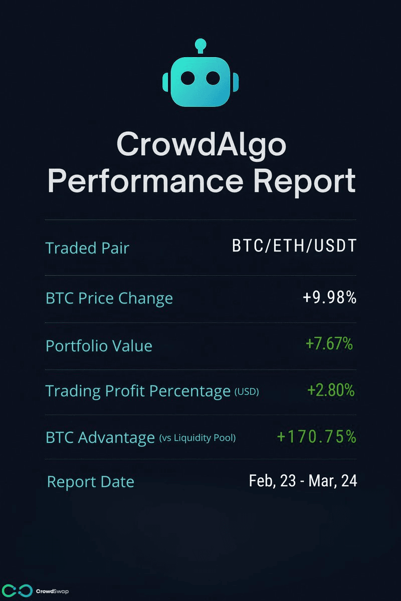 **CrowdAlgo Performance Update** CrowdSwap's automated trading system CrowdAlgo reported performance results for Feb 26, with profits calculated in USD as Bitcoin's price increased. **Key Details:** - The system continues to capitalize on market movements through automated trading - Liquidity yield represents only 0.03% of total profits in the example shown - CrowdSwap takes 30% of liquidity yield under the lifetime offer, with no share of other profits - The lifetime offer ends tomorrow (Feb 28) **How It Works:** CrowdAlgo adapts to different market conditions: - Rising prices: profits from the increase - Ranging markets: profits from fluctuations - Declining prices: accumulates more BTC The system recently expanded to Binance Smart Chain with a BNB/BTC opportunity and includes features like trend detection, token accumulation, and impermanent loss protection. [Learn more about CrowdAlgo](link in bio)