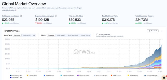 Cryptoโs bleeding, but RWA is exploding ๐ New ATH near $24,000,000,000 as institutions pile into tokenization. Trillions are next ๐ฅ