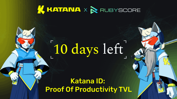 Hurry up, samurai! ⚔️ Only 10 days left until the end of Katana ID: Proof of Productivity TVL katana.rubyscore.io Boost your Score, mint your @katana ID, collect all the badges on RubyScore, and increase your chances of getting WL.