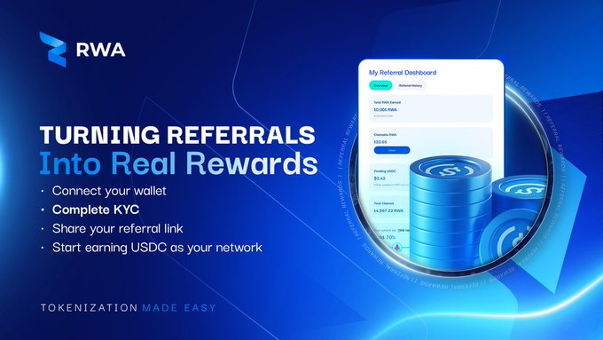 RWA Inc. Referral Program Earn USDC While Growing the Ecosystem The referral program continues to reward users who Bring new builders, investors and collectors into the RWA economy. How to get started: - Connect your wallet โ rwa.inc - Complete KYC - Share