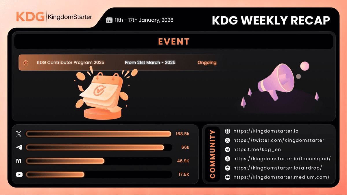 KingdomStarter (KDG) released its weekly recap covering recent developments in its GameFi launchpad operations. The update focuses on: - Ongoing launchpad activities - IDO (Initial DEX Offering) progress - Community engagement initiatives KDG continues its mission as a GameFi launchpad platform, connecting vetted blockchain gaming projects with early-stage investors. The platform specializes in Metaverse, NFT gaming, and play-to-earn projects. The weekly format provides regular updates to the KDG community on platform developments and upcoming token sales.