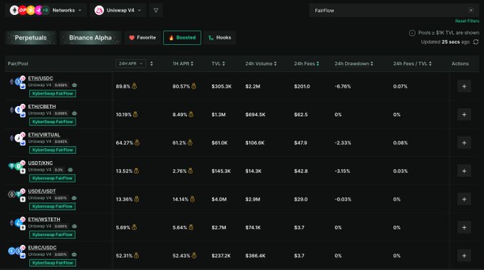 🚀 Good news, you can farm KyberSwap FairFlow pools directly on Krystal! 🔥 Top FairFlow APRs right now: 🥇 $BNB / $USDT 🥈 $ASTER / $USDT 🥉 $BNB / $CAKE Built by @KyberNetwork using @PancakeSwap hooks on @BNBCHAIN ⚡️ Try it now 👇 defi.krystal.app/pools?chainIds…