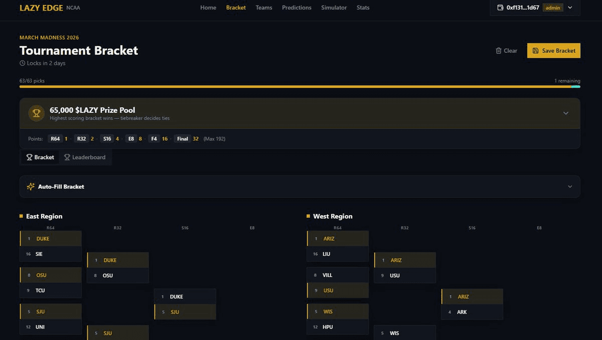 Lazy Edge has launched its March Madness Bracket Tournament featuring a 65,000 $LAZY prize pool. **Tournament Features:** - Custom Bracket Simulator to run thousands of scenarios - Edge Finder tool to identify optimal value plays - Prediction-based competition format This follows Lazy Edge's successful football season, which concluded with their Playoff Contest. The platform is expanding beyond football into a multi-sport predictive engine, with golf tournaments nearly complete and World Cup soccer simulations in development. The system continues to evolve with stronger simulations, improved data processing, and enhanced modeling capabilities for fantasy players and prediction markets. [Lock in your March Madness picks](link)