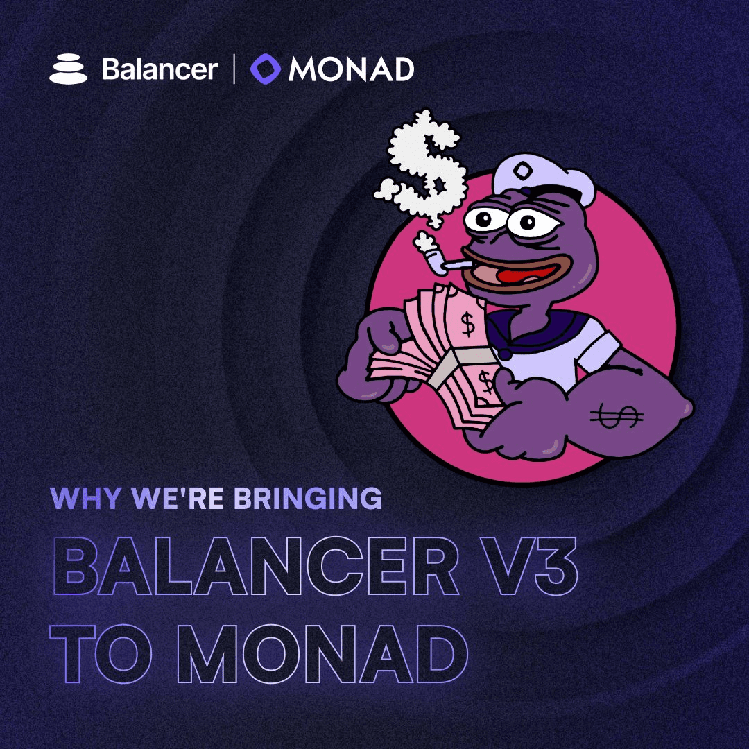 Balancer is launching its V3 protocol on Monad, an EVM-compatible blockchain capable of processing 10,000 transactions per second with sub-second finality. **Key Details:** - Monad's infrastructure focuses on high-speed execution - Balancer V3 brings programmable liquidity infrastructure to the chain - The integration aims to match fast execution with efficient liquidity management The deployment represents a pairing of Monad's performance capabilities with Balancer's liquidity solutions. Users can follow [@Balancer](https://twitter.com/Balancer) for launch updates and partnership announcements.